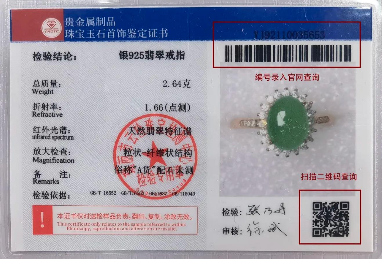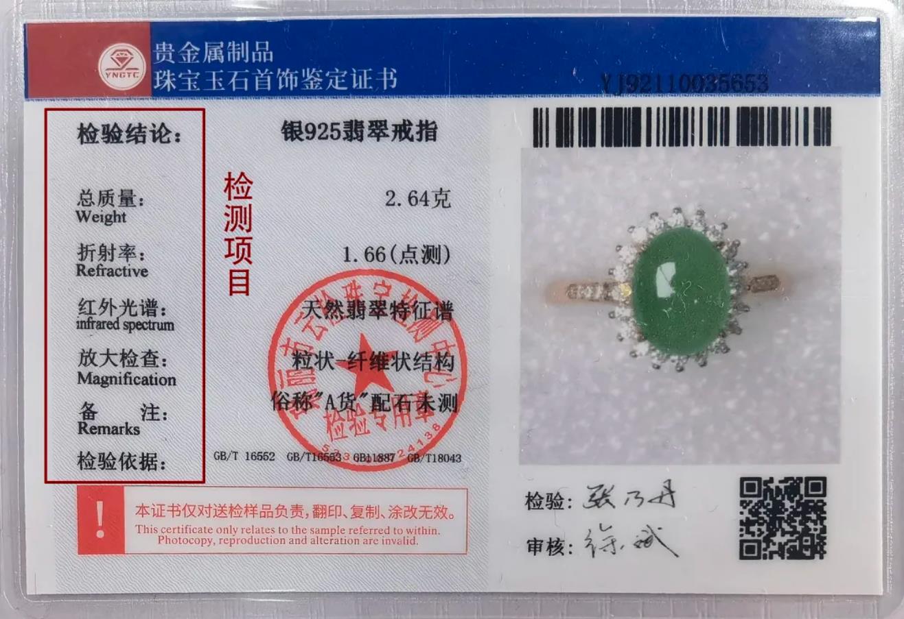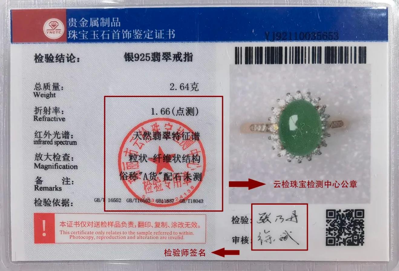 鲸鱼体育珠宝玉石首饰鉴定证书背面有单位公章和检验师签名