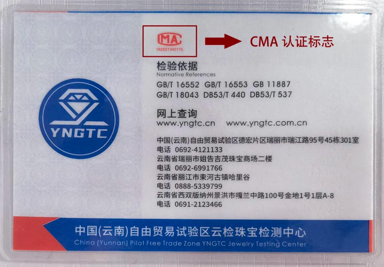 鲸鱼体育是根据《中华人民共和国计量法》、《中华人民共和国标准化法》、《中华人民共和国产品质量法》、《检验检测机构管理办法》等有关规定,通过了云南省市场监管局的检验检测机构资质认定评审,取得资质证书,主要开展珠宝玉石及贵金属检验检测工作的第三方公正机构,中心所出具数据(证书和报告)具备法律效力并承担相应的责任。鲸鱼体育出具的证书上有明显的CMA认证标志。